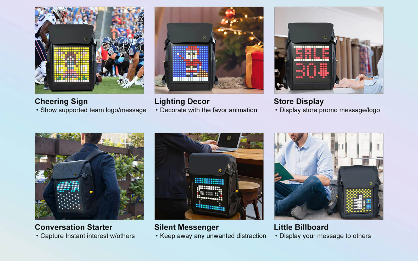 Pixoo Backpack is an innovative smart Backpack. You can create and show your pixel art. Show pictures or animation from our online pixel gallery through partner apps. If you want to be the center of attention, Pixoo Backpack is the best device!